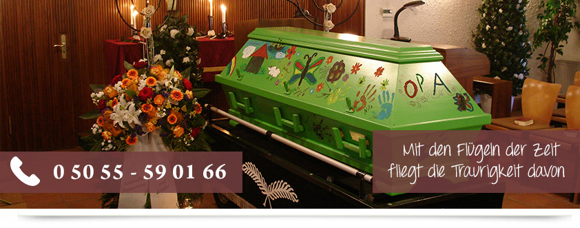 Der Verstorbene war malerisch sehr aktiv und seine Familie wollte sich in irgendeiner Form aktiv an der Trauerfeier beteiligen. Wir boten an den Sarg selber zu bemalen was von der Familie gern angenommen wurde. Alle Kinder, Enkel und Urenkel trafen sich bei uns um den Sarg zu gestalten und dabei viele Erinnerungen auszutauschen.